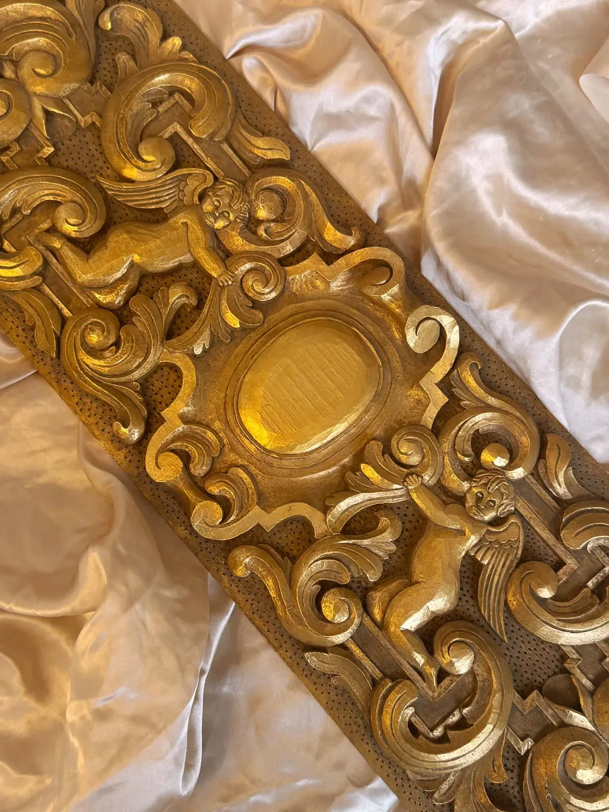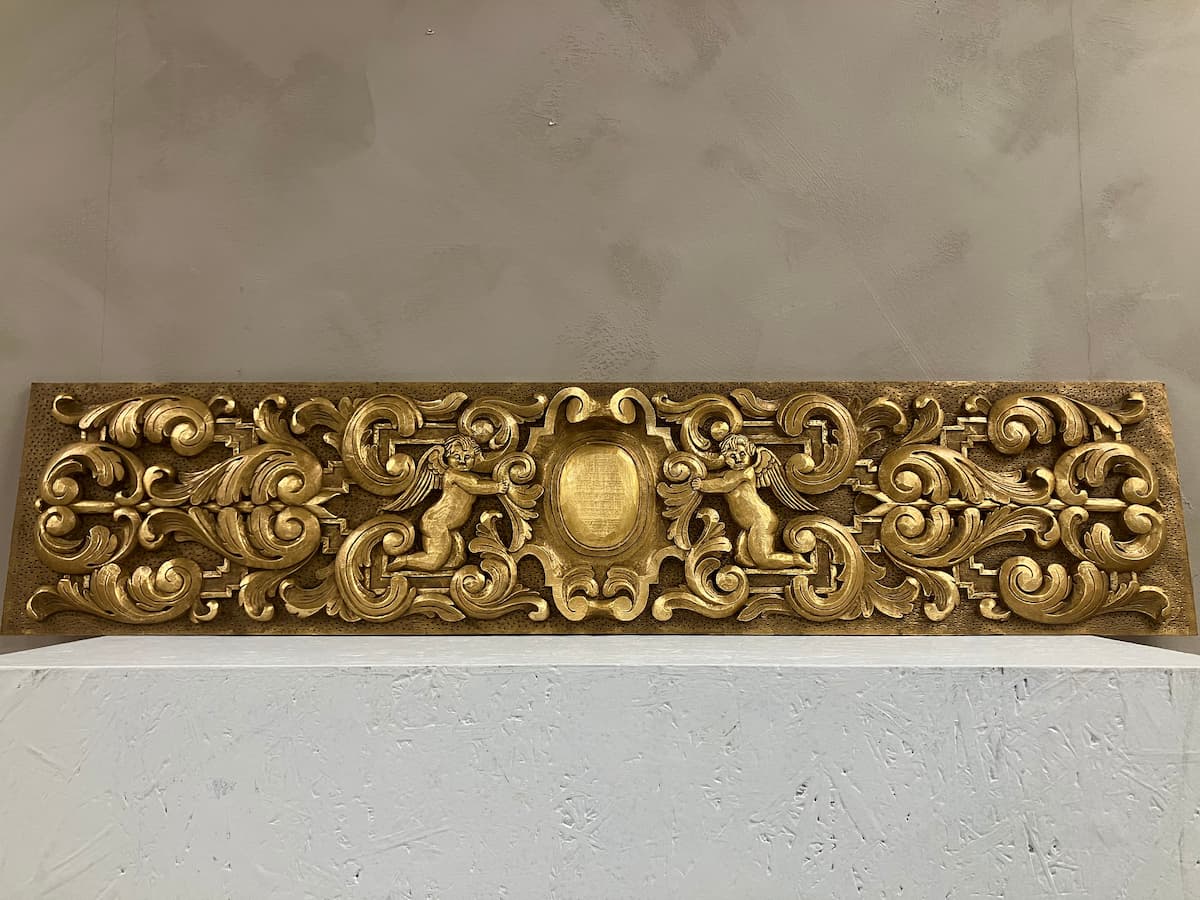 Gjord av massiv lind, skuren förhand med bildhuggarjärn, lagt slagmetall (mässing) samt patinerat med oljefärger.